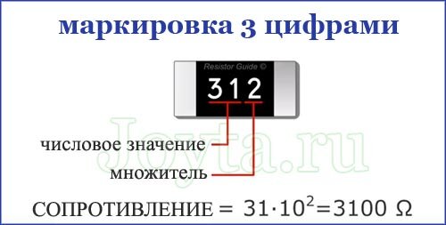 SMD (от англ. Surface Mounted Device) можно отнести к любому малогабаритному электронному компоненту, предназначенному для монтажа на поверхность платы по технологии SMT (технология поверхностного монтажа). SMD резисторы – это миниатюрные резисторы, предназначенные для поверхностного монтажа. Вместо проволочных выводов обычных резисторов, которые вставляются в отверстия печатной платы, у SMD резисторов имеются небольшие контакты, которые припаяны к поверхности корпуса резистора. Это избавляет от необходимости делать отверстия в печатной плате, и тем самым позволяет более эффективно использовать всю ее поверхность. Маркировка SMD резисторов Из-за малого размера SMD резисторов, на них практически невозможно нанести традиционную цветовую маркировку резисторов. В связи с этим был разработан особый способ маркировки. Наиболее часто встречающаяся маркировка содержит три или четыре цифры, либо две цифры и букву. Маркировка с 3 и 4 цифрами В этой системе первые две или три цифры обозначают ч