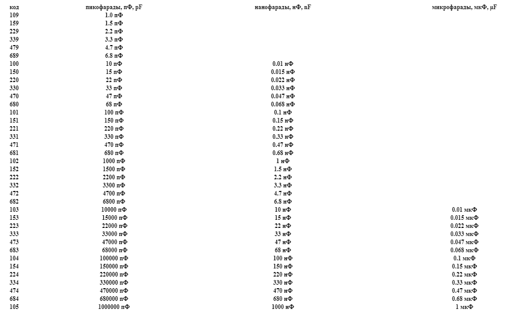Первые две цифры указывают на значение емкости в пигофарадах (пф), последняя — количество нулей. Когда конденсатор имеет емкость менее 10 пФ, то последняя цифра может быть «9». При емкостях меньше 1.0 пФ первая цифра «0». Буква R используется в качестве десятичной запятой. Например, код 010 равен 1.0 пФ, код 0R5 — 0.5 пф.
