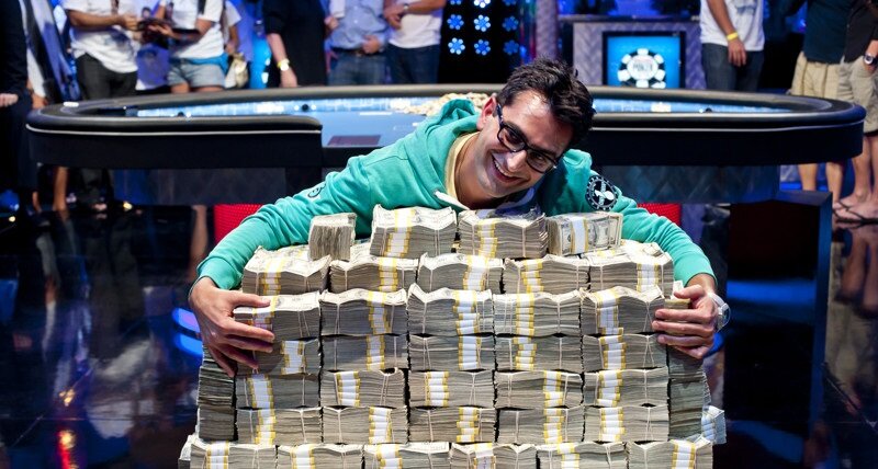 В современном покере много дорогих турниров и самый известный из них – The Big One for One Drop, стоимость участия в котором 1 000 000$. Впервые этот турнир сыграли в 2012 года на серии WSOP (Мировая покерная серия) в Лас-Вегасе и это событие вошло в историю. Турнир собрал 48 входов, что значит, что 48 игроков внесли по миллиону долларов, чтобы поиграть в покер. 5,3 млн из этой суммы были направлены на благотворительность (такие условия участия в турнире), а 42,7 млн – остались в призовом фонде, который в итоге поделили между собой 9 лучших игроков события. Чемпионом турнира стал американский профессиональный игрок в покер Антонио Эсфандиари. Его выигрыш составил 18 350 000$ и это самые крупные призовые в истории турнирного покера. На самом деле в покере только 20 людям удалось выиграть больше 18 000 000$ за всю карьеру. А тут такая сумма – за один турнир. В целом на счету Эсфандиари турнирных выигрышей на сумму больше, чем 33 млн долларов. В финальной схватке The Big One for One D