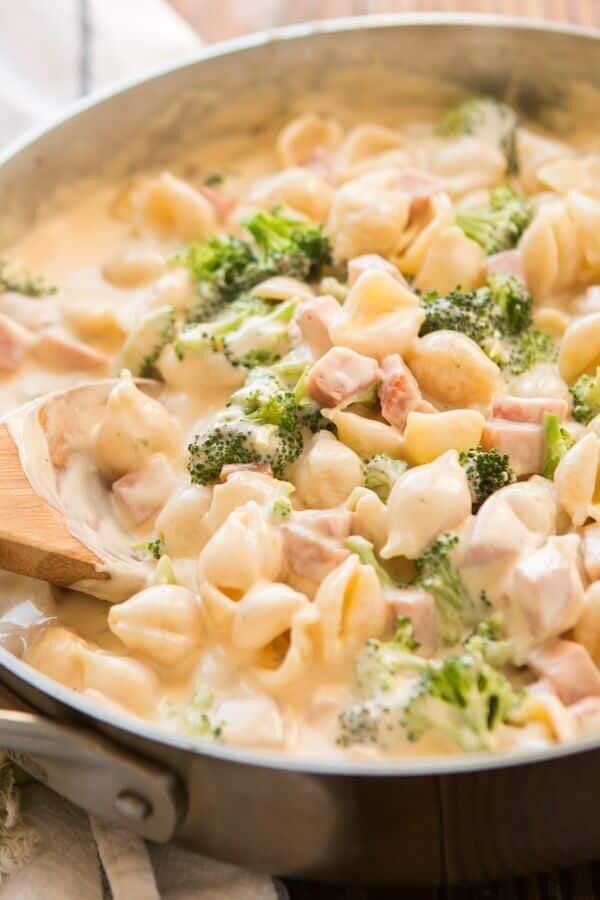 2. Тем временем приготовьте соус. В кастрюле разогрейте масло, обжарьте лук в течение 5 минут, добавьте чеснок, готовьте еще минуту. Положите горчицу, ветчину, сливки, посолите, поперчите. Доведите до кипения, снимите с огня, добавьте макароны и брокколи, тертый сыр. Все как следует перемешайте. Приятного аппетита!