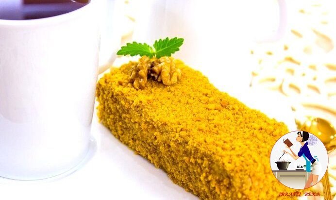 Juda ham mazali deser ! Yumshoq, nozik va ajoyib ta'mga ega. Yaqinlaringizni lol qoldirish vaqti keldi. Kundalik taomnomangiz uchun ajoyib yangilik. Tayyorlanishi hech qanday qiyinchilik tug'dirmaydi. Buni albatta tayyorlang ! Kerakli masalliqlar : 100 gramm asal 1 choy qoshiq ichimlik sodasi 50-100 gramm shakar 30 gramm saryog' 1 dona tuxum 250-300 gramm un Krem uchun : 300 gramm smetana 50-100 gramm shakar 100 gramm yong'oq Tayyorlash usullari : 1. Asalni o'rta hajmdagi kastryulkaga soling. 2. Eriting. 3. Ichimlik sodasini soling. 4. Aralashtiring. 5. Shakarni soling. Aralashtiring. 6. Jigarrang tusga kirgunga qadar pishiring. 7. Tayyorlangan massani olovdan oling va boshqa idishga soling. 8. Saryog'ni soling. 9. Aralashtiring va sovuting. 10. Tuxumni soling va aralashtiring. 11. Unni soling va xamir qoring. 12. Tayyorlangan xamirni 5 qismga bo'ling. Har bir xamir qismini yoyib chiqing. 180 darajada qizdirilgan gaz pechida 5-10 daqiqa davomida pishiring. 13. Tayyor korjlardan 20x12