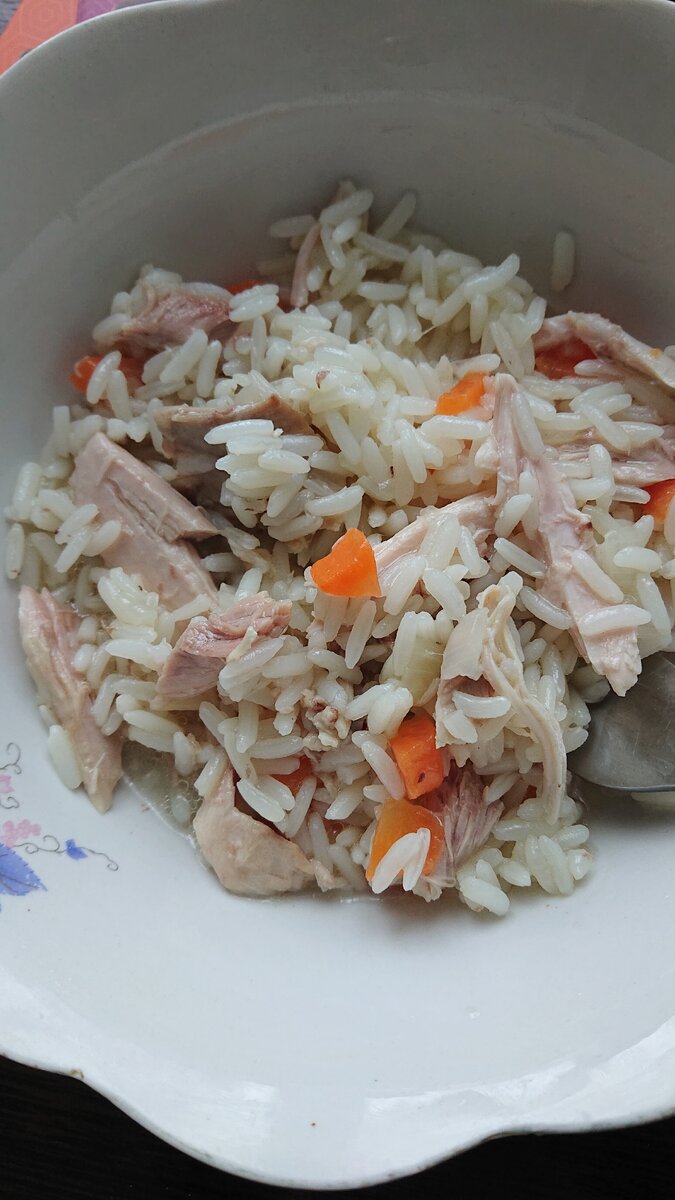 Последнюю неделю приходилось питаться исключительно подножным кормом. То сосиску перехвачу, то йогурт закину. Были правда и пельмени, но за готовку их я не считаю. И вот сегодня решила приготовить себе куриный суп. С утра поставила вариться бедро на кости. Варила-варила, уже и лук нарезала, и морковку почистила. И вдруг соседи засверлили. Да так, что казалось, что сверлят прямо у меня на кухне. Сыну этот звук не понравился. Испугался. Пришлось экстренно собираться на прогулку. Курица уже сварилась, я выключила огонь, и мы ушли. Когда вернулись, куриного супа уже не хотелось. Решила сварганить плов. Обычно я готовлю по-другому. Но сейчас имелась отварная курица в бульоне, лук, морковь. И рис пропаренный, который нужно было сварить. Вытащила я это несчастное бедрышко из бульона и насыпала туда рис. Пропорции примерно такие: одна часть риса к двум частям бульона. Ну, как обычно варим рис, так и засыпала. В остывшую воду. Пока рис варился, не забывала его переодически мешать. Где-то когда