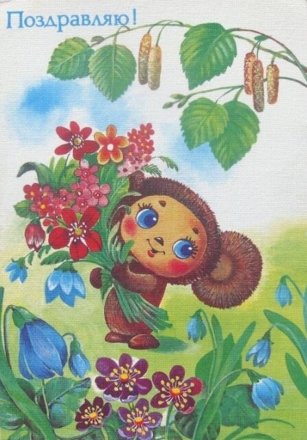 Вот такая советская открытка натолкнула меня на рисование открытки «Чебурашка с букетом». Эту открытку мы рисовали с учениками начальных классов.