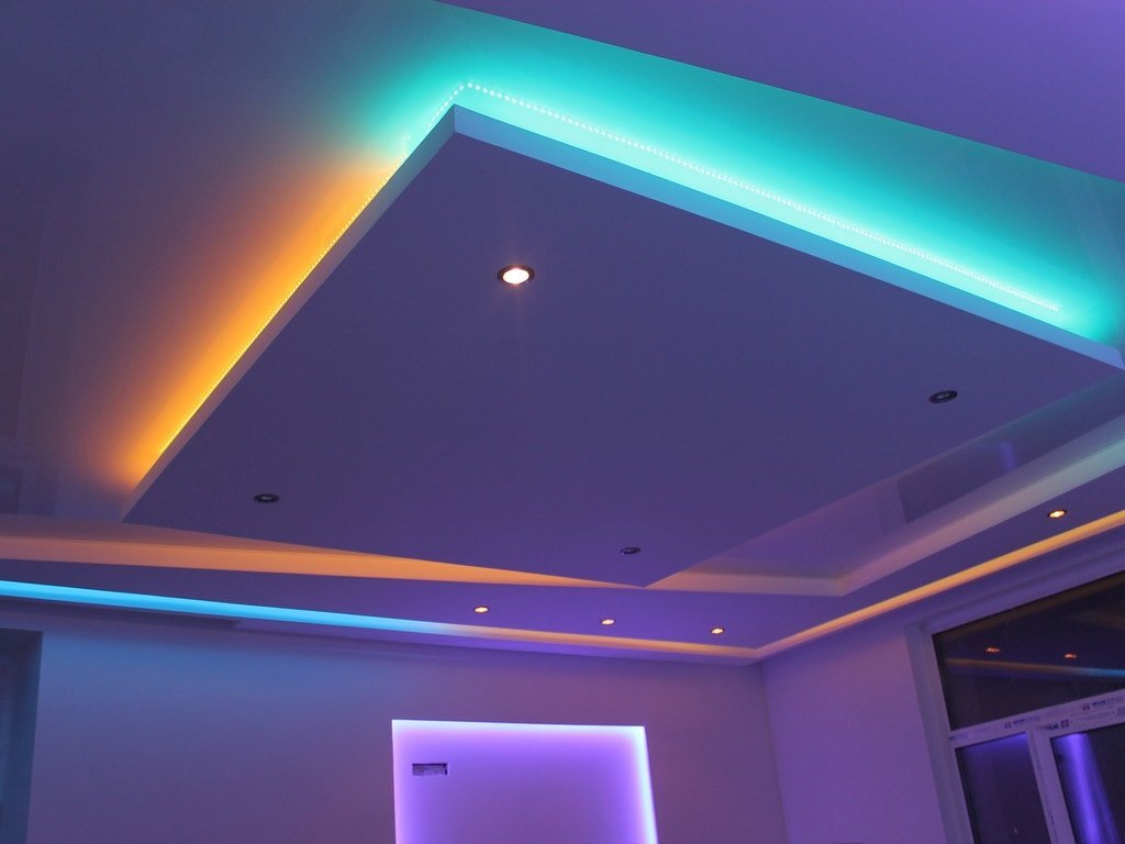 Нередко встречаются заказы на двух или даже более уровневые потолки. Так, в рамках одной потолочной поверхности выполняется двухуровневая профильная конструкция, на каждую из которых наносится свое натяжное полотно. Выбирая материал, рекомендуется играть на контрастах, в конечном результате это дает более интересные и объемные потолки. К примеру, сочетание тканевой фактуры и натяжной пленки, светлых матовых оттенков и темных глянцевых, сдержанный пастельный и кричащий алый. К тому же, двухуровневые натяжные потолки подходят для помещений различного целевого назначения. Использование данного вида потолков позволяет выполнить сразу несколько задач: