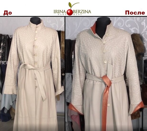 Добавить что-то новое в изделие - это отличный способ освежить вещь. Именно с этой позиции мы и совершили данный ремонт. Фото до: В пальто мы убирали клеш, сделав его более прямым. А также укоротили изделие. В пальто был короткий пояс, длинны которого не хватало его хозяйке. Поэтому мы удлиняли пояс за счет его нижней части. Изделию необходимо было придать свежести, поэтому нам нужен был какой то акцент. Мы украсили его яркой, перламутровой кожей. Перламутровую кожу мы добавим в воротник-стойку, а также в нижнюю часть пояса и манжета. Вот и все изменения, которые мы привнесли в ходе ремонта данного плаща. Предлагаем вам оценить готовое изделие: Фото после: Если вам понравилась работа и вы хотели бы задать вопрос или поделиться своими результатами, связывайтесь с нами и мы с радостью вам поможем. Так же у нас есть возможность покупки мастер-классов по работе с кожей и мехом. Контакты: VK: https://vk.com/irina_berzina VK: https://vk.com/irinaberzina_mk FB: https://www.facebook.com/berzi
