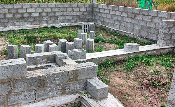 Возведение несущих стен бани происходит после заливки ленточного или столбчатого фундамента. Блоки имеют свойство впитывать влагу, а для стен это катастрофическая проблема. Чтобы избежать неприятных сюрпризов в дальнейшем, то нулевой уровень фундамента должен быть выше уровня грунта на полметра. Возведение стен происходит по стандартным нормам и правилам, но чтобы шлакоблоки имели достаточное скрепление между собой, а стена была «монолитом», то между накладными рядами укладывается армированная металлическая сетка.