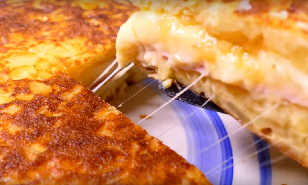 Очень вкусный рецепт. Это типичный испанский картофельный омлет, но в этом случае, фаршированный ветчиной и сыром, как сэндвич. ИНГРЕДИЕНТЫ 3 ЧЕЛОВЕКА: 3 средних картофелины 5 яиц 1/2 луковицы 4 ломтика ветчины (если вы берете нарезку) 8 ломтиков сыра (если вы берете нарезанный сыр для сэндвичей) соль по вкусу оливковое (растительное) масло 1. Картофель нарежьте очень мелкими кубиками, а лук крупными кусками. Разогрейте сковороду на среднем огне и добавьте немного растительного масла. Выложите картофель и лук на сковороду, добавьте щепотку соли. 2. Жарьте на среднем огне при постоянном помешивании, около 10 минут. 3. Когда картофель станет мягким, подавите его лопаткой, чтобы он стал еще мельче. После этого, жарьте еще 5 минут, постепенно превращая в пюре. 4. Когда картофель будет готов, разбейте в отдельную миску яйца, добавьте щепотку соли и взбейте вилкой. 5. Добавьте в яйца картофельное пюре и перемешайте до получения однородной массы. 6. В небольшую, но глубокую сковороду на