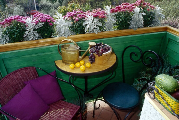 Открытый балкон — хорошо или плохо? Если в «комплект» Вашей квартиры входит балкон, предлагаем смотреть на него как на элемент положительный! Его никуда не деть, а значит нужно задействовать с пользой — для души, для эстетического удовлетворения — своего и проходящих по улице «зрителей». Ниже представлено несколько идей. Не спешите их отвергать только по той причине, что не все балконы, изображенные на фото — из типовых отечественных проектов. Постарайтесь увидеть идею и адаптируйте ее под свои обстоятельства! По-французски изящно Даже на очень узком балконе можно разместить изящный ажурный, либо глянцевый круглый столик с одним или двумя стульчиками. Мило, нарядно и не громоздко. Если балкон выходит в тихий внутренний двор, столик вполне можно использовать по назначению — чтобы выпить чашечку кофе. Безусловно, такая милая композиция не уживется с голубями, поэтому следует позаботиться о способе отпугнуть птиц. В деревенском стиле Если габариты открытого балкона чуть больше, чем миниа