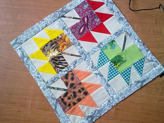 Немного изменив орнамент "Медвежья лапа", поменяв цвета и добавив всего один элемент ,легко получается блок "Кленовый лист". Для одного блока выкроила квадраты 5х5 см с припуском на шов. Сложила два светлых и два зеленых квадрата лицевыми сторонами внутрь, провела диагональ и прошила с обеих сторон диагонали на о,7 см. Разрезала квадраты по диагонали, получаются квадраты из треугольников двух цветов. Оформляю квадрат для черенка листика, для этого разрезаю один светлый квадрат на два треугольника, беру полоску темно зеленой или коричневой ткани, складываю ее по длине вдвое, проутюживаю. И вшиваю ее между двух треугольников, срезами наружу. Утюжу, разутюживаю швы, обрезаю лишнее. Выкраиваю для одного листа еще три зеленых квадрата и один светлый и складываю "Кленовый лист". Сшиваю блок сначала в горизонтальные ряды, потом все вместе. Сшила еще три листочка разного цвета Собрала их в один блок в произвольном порядке, между блоков с листьями прошила полоск