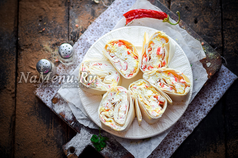 Ингредиенты: - лаваш армянский – 1 шт., - крабовые палочки – 80 г, - куриные яйца – 2 шт., - плавленый сыр – 1 шт., - твердый сыр – 50 г, - майонез – 2 ст.л., - соль, перец – по вкусу 🥄Смазать немного лаваш майонезом, притрусить молотым перцем 🦀Сверху добавить нарезанные мелкими кубиками палочки 🧀Отваренные яйца и сыр натереть на мелкой терке ❄️Плавленый сыр бросить в морозильную камеру на 20 мин., а затем натертую стружку плавленого сыра разложить по поверхности лаваша 🕰Свернуть лаваш по краям – вовнутрь. После завернуть рулетом, убрать в холодильник на 3-4 часа https://namenu.ru/10473/Rulet_iz_lavasha_s_krabovymi_palochkami
