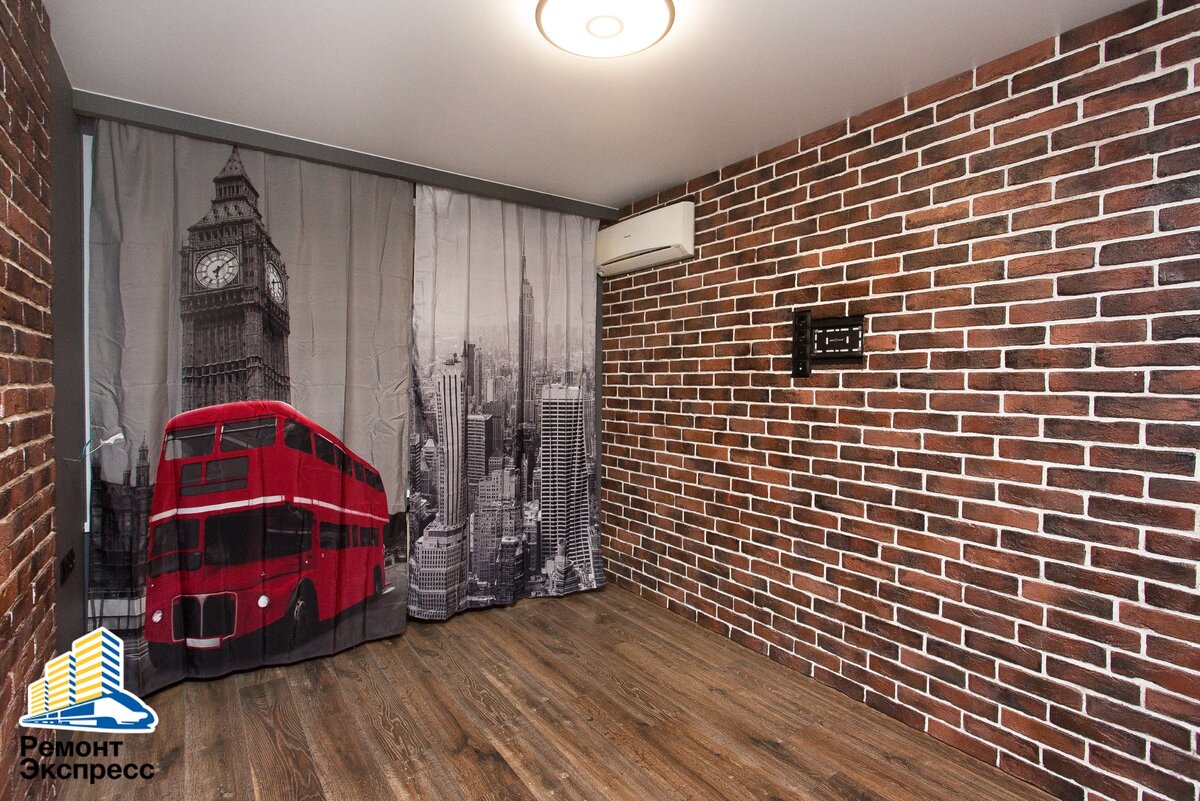 Мы провели капитальный ремонт комнаты и коридора. Заново выровняли стены и пол. Оклеили стены обоями под покраску и плиткой под кирпич, покрасили в 2 слоя. На пол уложили ламинат и плитку. Установили натяжной потолок, кондиционер и дополнительные розетки.
