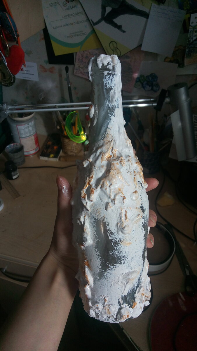 Всем привет! И сегодня предлагаю сделать простую, но очень симпатичную вазу из простой стеклянной бутылки. Не можете читать сейчас? Подписывайтесь на инфоканал автора. Анонсы статей и творческая информация, которую я не даю на Дзен канале (распродажи в творческих школах, интересные марафоны, закрытые уроки от автора канала и др.), жмите и переходите по нужной ссылке: Карта канала (здесь все актуальные ссылки на ресурсы автора) Мы не будем делать практически ничего. А точнее мы будем использовать технику свободного литья гипса ( ну я так с барского плеча посмела ее называть, не знаю, есть ли что-то подобное на самом деле). Ну в общем в лучших тенденциях дизайна сегодня: просто, без усилий, близко к природным формам. Нам нужны: 1. Бутылка 2. Гипс ( можно хоть строительный, хоть купленный в художественных магазинах) 3. Акрил белый 4. Золото, блестки (необязательно) 5. Лак Начнем. У меня вот такая бутылка, когда-то что-то начинала делать на ней для учебы, передумала, а эта бутылка так и