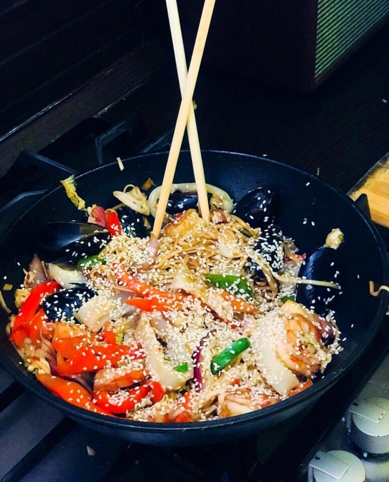 Всем привет, сегодня я делюсь с Вами очень простым рецептом приготовления wok-лапши с морепродуктами! WOK готовится всего 15 минут, а вкус Вас очень порадует! Приступаем к готовке, заранее подготовьте все ингредиенты. Процесс готовки протекает очень быстро и требует постоянного контроля. ИНГРЕДИЕНТЫ: ( на 1 порцию) 1/4 красного болгарского перца; 1/4 зеленого болгарского перца; 1/2 красного перца; 1/2 репчатого лука; 10-15 грамм свежего имбиря; 2-3 зубчика чеснока; 180-200 гр. лапши (УДОН); 3-4 креветки( размер 16-25); 1-2 кальмара; 2-3 мидии; 25 гр. виноградной чачи( коньяк, если нет чачи); Соевый соус по вкусу; Соус терияки по вкусу; Сладкий чили по вкусу; Способ приготовления: 1.Очень мелким кубиком нарезать имбирь, чеснок. Перец Чили нарезать кольцами, семена оставляем. 2. Налить в кастрюлю воды, подсолить, как закипит -опустить в нее лапшу, варить 4-6 мину, после слить воду, промыть холодной проточной водой. 3. Поставить WOK на максимальный нагрев, добавить масло, дождаться ко