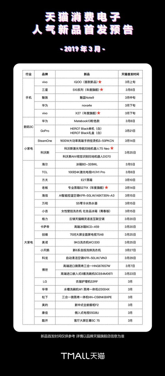 На первой позиции находится дебютный смартфон от iQOO, и он будет доступен уже 1 марта. Напомним, что iQOO — это новый бренд от компании Vivo, который предназначен для создания премиальных смартфонов с необычными функциями. Из недавних утечек информации из китайского регулятора TENAA мы уже знаем, что новинка получит Snapdragon 855 в качестве аппаратной основы, а так же AMOLED дисплей и тройную основную камеру. Далее по списку находится новый флагман Samsung Galaxy S10, который был представлен на днях, но в продажу еще не поступал. В Tmall он доступен для предварительного заказа, но покупатели смогут получить свои смартфоны уже 8 марта. Здесь же появился и Meizu Note 9, который до сих пор не был представлен. Дата презентации назначена на 6 марта, соответственно купить новинку можно будет ближе к середине месяца.