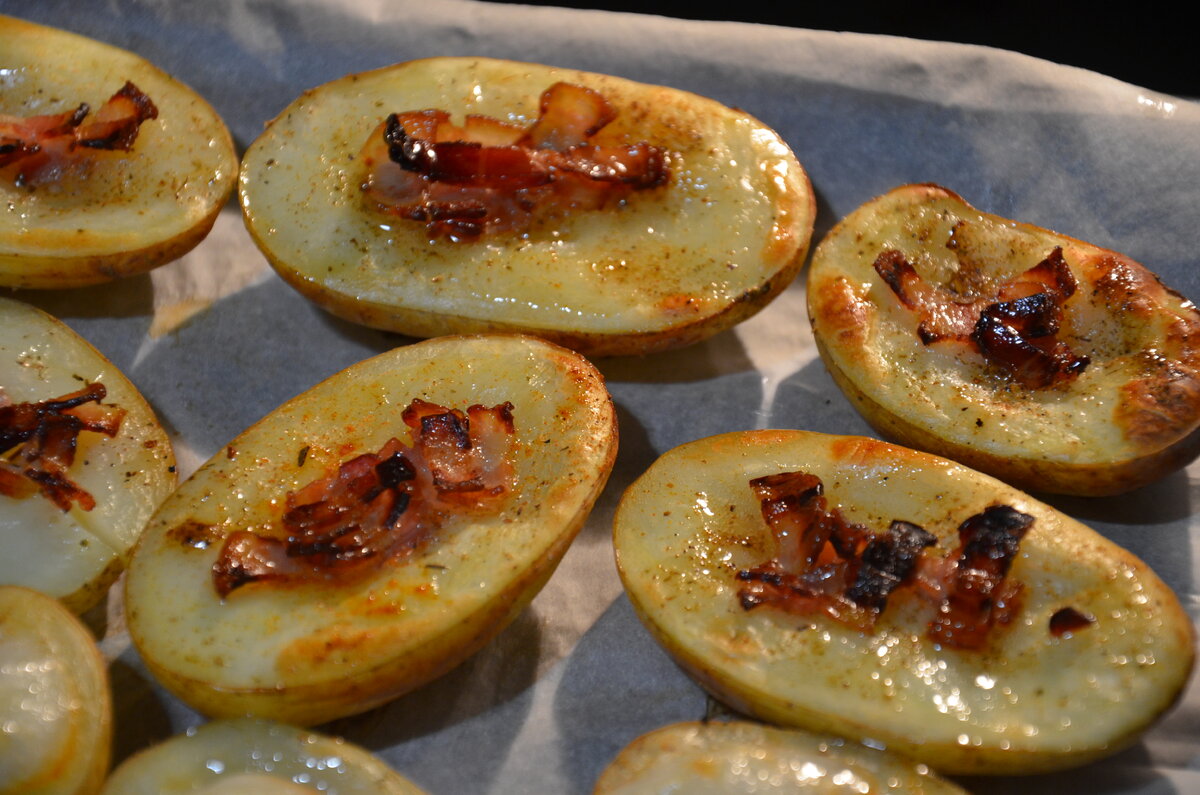 Я не собиралась писать статью с этим, казалось бы, простым рецептом. Но и здесь, как мне вспомнилось, есть нюансы. Я когда-то испекла свою первую картошку, и получились камни. Я пекла её при 180 градусах. Это было долго. И мучительно. И невкусно. СтОило увеличить температуру до 200-210 и хорошенько смазать её маслом и через 20 минут вкусная и румяная картошечка готова! Это отличный полдник или ужин после долгой прогулки, когда так хочется основательно согреться и подкрепиться. Итак. Картофель хорошо моем, режем пополам. Делаем выемку в каждой половинке, чтобы масло не вытекало в процессе запекания. Смазываем кисточкой маслом, посыпаем солью и специями. Кладём кусочек сала или бекона. Ставим в духовку и через 25 минут можно подавать. Сверху после готовки смазываю чесночным маслом (чеснок через пресс+растительное масло, дать настояться). Можно подать со сливочным или творожным сыром, с зеленью, с плавленным сыром, со свежим салатом из зелёной редьки и моркови, с тушёными овощами, сол