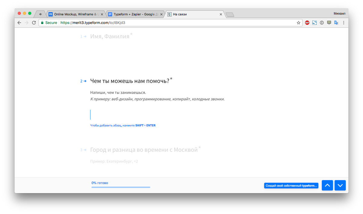 📋 Анкета через Typeform: Мы создали простую форму, в которой подрядчик указывает: Typeform выбрали за удобный интерфейс и возможность адаптировать под любые вопросы — быстро и без кода. Человек заполняет её, и данные с помощью Zapier передаются к нам в Trello. Сохраняются контакты подрядчика, можем переместить его в соответствующий столбец, к примеру «Тестируем», отфильтровать по направлениям, прокомментировать его.