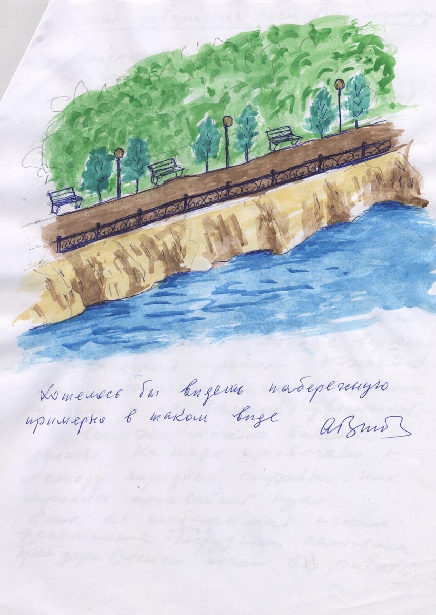 Жители Карпинска внесли предложение по благоустройству набережной. О чем прислали письмо в редакцию "Карпинского рабочего". А Аполлон Иванович Воложенинов и рисунок нарисовал - как могла бы выглядеть благоустроенная набережная Логическое завершение гостевого маршрута В последнее время часто звучит тема гостевого маршрута. Хотелось бы, чтобы он завершился гостиницей и парком угольщиков. Вернее, парком и набережной вдоль берега Богословского озера.
