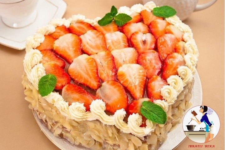Ajoyib deser ! Nozik va mazali ta'mga ega. Tayyorlanishi oddiy, natijasi esa sizni lol qoldirishi turgan gap. Bayram dasturxoni uchun ajoyib tanlov. Yaqinlaringizni lol qoldirish vaqti keldi. Taomnomangiz uchun yangilik. Buni albatta tayyorlang ! Kerakli masalliqlar : 3 dona tuxum 150 gramm shakar 2 choy qoshiq vanilin shakari 200 gramm smetana 150 gramm quyultirilgan sut 3 osh qoshiq kakao kukuni 200-250 gramm un 2 choy qoshiq qabartma Krem uchun : 250 gramm maskarpone (almette, filadelfiya) 500 ml qaymoq 150 gramm shakar Abrikos kompoti mevalari bilan birga Shuningdek : Qulupnoy Jele tort uchun Bodom slaysi Tayyorlash usullari : 1. Xamirni tayyorlang. Tuxum va shakar, vanilin shakarini aralashtiring. 2. Smetanani soling va aralashtiring. 3. Quyultirilgan sutni qo'shing. 4. Ka kao kukunini soling va aralashtiring. 5. Un va qabartmani soling, quyuq xamir qoring. 6. Yog' surtilgan pishirish qolipiga xamirning teng yarmini soling. 180 darajada qizdirilgan gaz pechida 20-25 daqiqa davomi