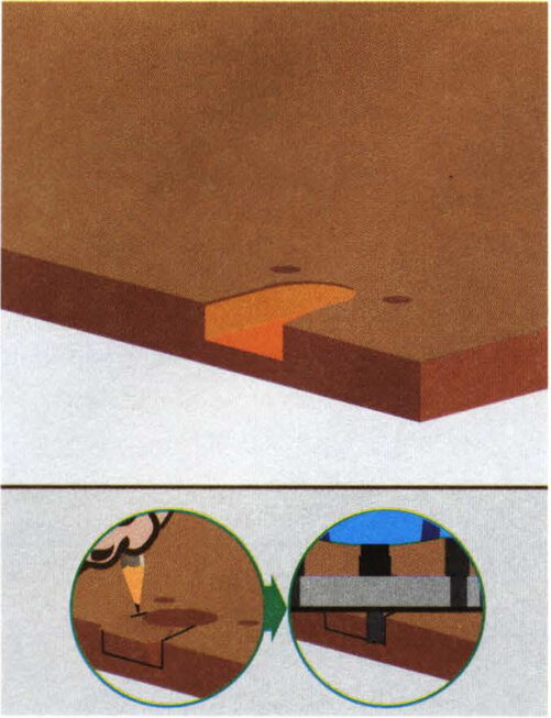 Из-за нагрузок и длительной эксплуатации даже гнездо мебельного навеса может разрушиться и прийти в негодность. Рассмотрим, как восстановить целостность ДСП в месте повреждения и заново закрепить навес. Инструменты для работы: карандаш, угольник, ручной фрезер, дрель, шуруповерт или отвертка, сверло Форстнера 35 мм, наждачная бумага. Как восстановить гнездо для крепление мебельной петли Очерчиваем место повреждения и ручным фрезером делаем выборку на глубину 12-14 мм. По контуру и толщине выборки вырезаем деревянную плашку и приклеиваем ее в углубление. После полного высыхания клея стачиваем выступающие части по уровням торца и плоскости. Устанавливаем мебельные петли на отреставрированное гнездо.