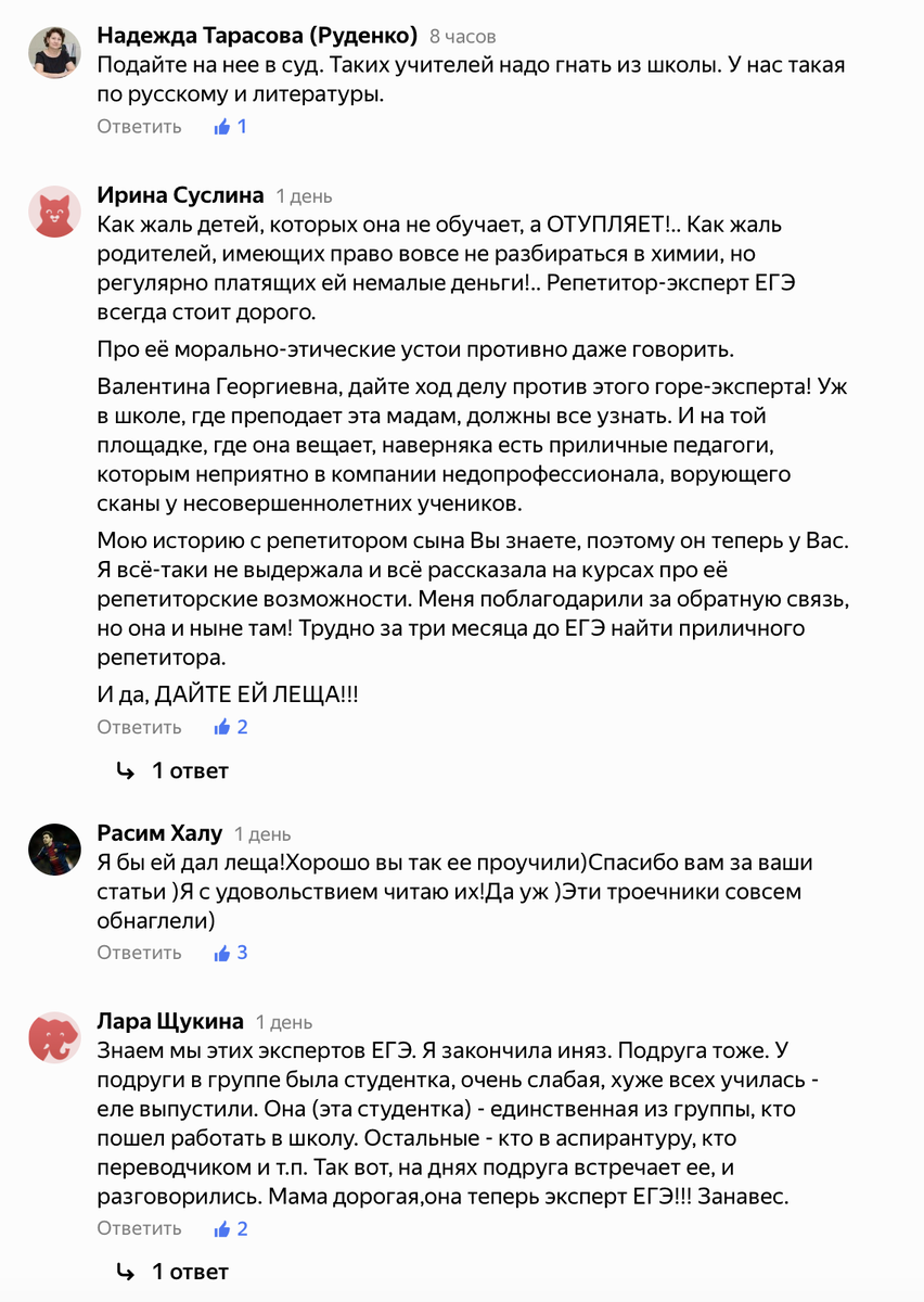 А как наеду, не спущу! А.С. Пушкин Несколько дней назад появилась моя статья "Осел останется ослом, хотя осыпь его звездами..." или передаю привет так называемому эксперту ЕГЭ по химии". Я рассказала реальную историю о том, как эксперт ЕГЭ по химии публично смешивает с грязью блестяще написанную и высоко оцененную работу моего ученика только лишь потому, что задачи второй части ЕГЭ по химии были решены и оформлены не только безупречно, но и намного интересней и рациональней, нежели их решает, а тем более, объясняет так называемый эксперт ЕГЭ. Я получила много отзывов на эту статью. Люди писали и жаловались, рассказывая о том, что аналогичные случаи происходят сплошь и рядом. Оказывается, многие эксперты ЕГЭ запугивают детей и родителей якобы их великой значимостью и возможностью повлиять на результат ЕГЭ, а также их незаменимостью в обучении ребенка. Они сами настолько уверились в своей безнаказанности, что без стеснения воруют чужие материалы, гадят своим коллегам да еще и выставляю