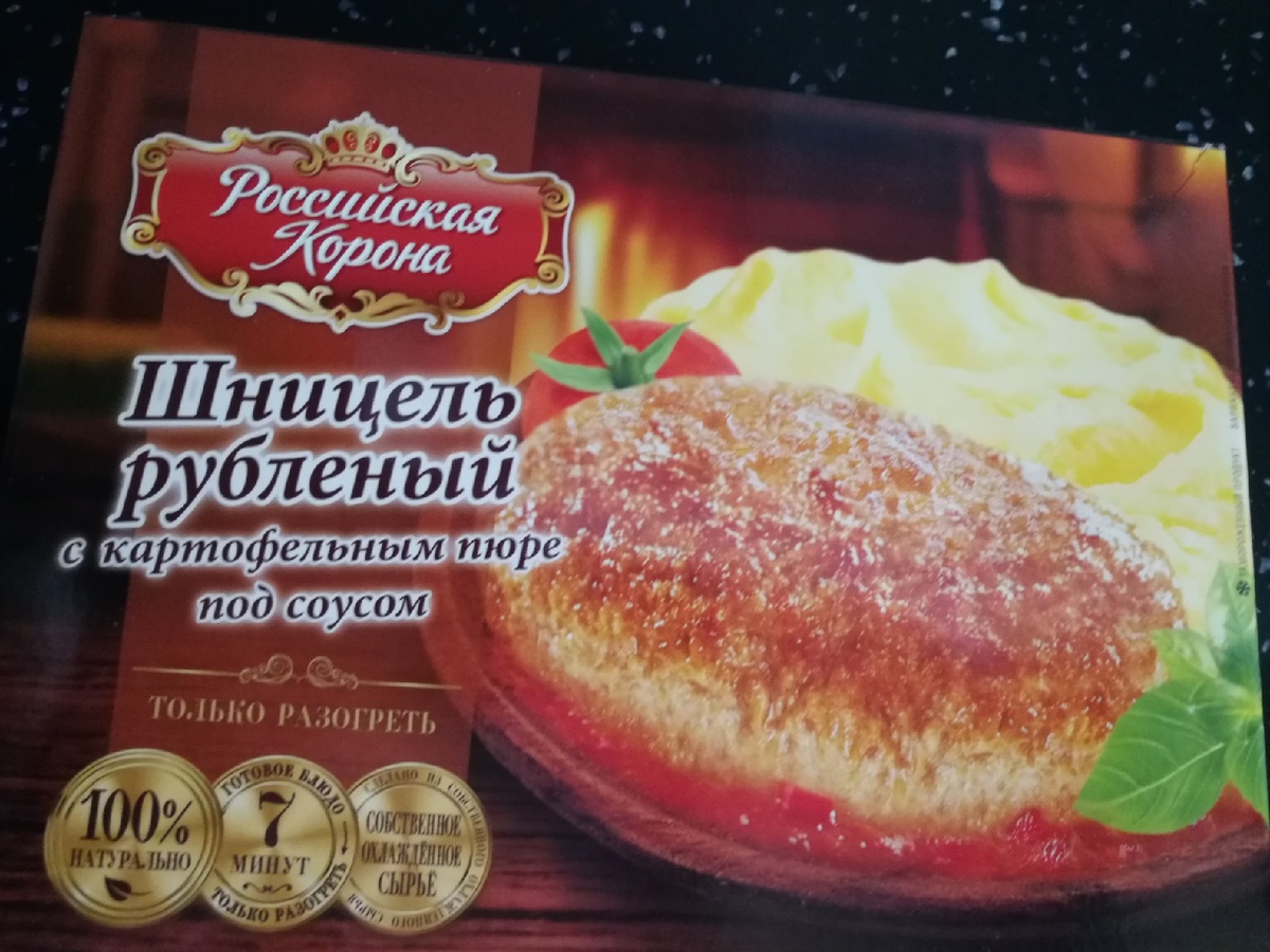 Сегодня у нас на очереди рубленый шницель с картофельным пюре и соусом. Цену точно не скажу, акционная где-то в районе 79 рублей. Коробка выглядит так: Производитель обещает нам 100% натуральный продукт. В целом, если верить составу, не врёт. Замороженный продукт выглядит так: осле разогрева: Очень сытно. На вкус средне, но на счет натуральности нет никаких сомнений. Картошка и котлета натуральные на все сто, по крайней мере на вкус. Соус не понравился совсем, какой-то кисло-острый, водянистый. Можно смело брать на обед на работу, однако дома есть такое каждый день я бы не стал. Шницель-котлетка – 6 из 10. Постный на вкус. Пюрешка – 10 из 10. Очень вкусно. Соус – 2 из 10. За то, что он есть.