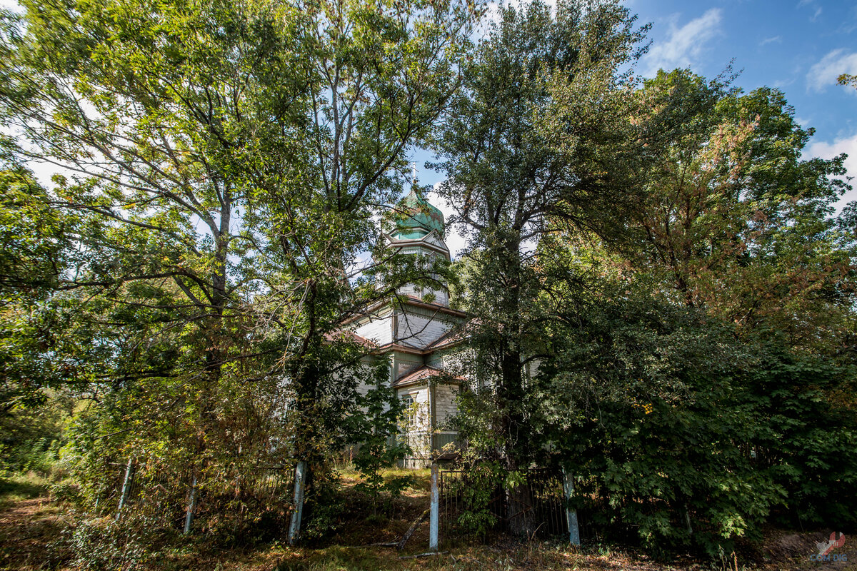Сегодня речь пойдет о одном необычном месте, которое нам удалось посетить в одном из походов в Чернобыльскую зону отчуждения. До этого я и подумать не мог, что в Чернобыльской зоне вообще остались такие отлично сохранившиеся места. Всё что нам удалось увидеть, предоставлено в виде фотоматериала в этой статье. Речь пойдет о хорошо сохранившемся храме. Храм расположен в заброшенном селе Красно. Сам храм отмечен на карте и найти его может любой желающий. Нас он заинтересовал сразу, и можно сказать это была главная цель всего путешествия на левый берег. За высокими деревьями, за невысоким заборчиком выглядывал старый купол. Хочется отметить, что храм окружен десятками безжизненных домов с заросшими непроходимыми дворами, и в 16 километрах (если идти пешком по нашему маршруту) от города Припять. Пока добирались до села по дороге не встретили ни души. Подходим ближе и думаем что сейчас вот-вот кто-то выйдет навстречу. Но никто не вышел. И это хорошо. Двери храма были закрыты очень просте