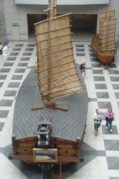 Начало тут Имдинская война В Корее пошли слухи о возможном нападении Японии. Ли Сун Син тоже придерживался этого мнения. И не зря. В 1592 году японские войска вторглись в Корею. Ли Сун Сина назначили главнокомандующим военно-морского флота Кореи. Он смог противостоять японскому флоту в битве при Танхпо, отправив на дно 72 военных корабля Японии с помощью кораблей кобуксон. Ли Сун Син смог преградить вторжение японских войск вблизи Пусана. И японцы решили начать переговоры, которые длились около 3х лет. Корабль Кобуксон в Военном музее Сеула (вид сверху) Корабль Кобуксон в Военном музее Сеула Корабль Кобуксон (вид спереди) Корабль Кобуксон внутри Мини версия корабля Кобуксон в морском музее Кобуксон – военный корабль-черепаха. Самой знаменитой моделью кобуксона считается модель, придуманная адмиралом Ли Сун Сином. Он доработал раннее придуманные модели корабля, снарядил их пятью видами пушек. Сверху корабль был покрыт железными пластинами, которые служили броней корабля, и которые напо