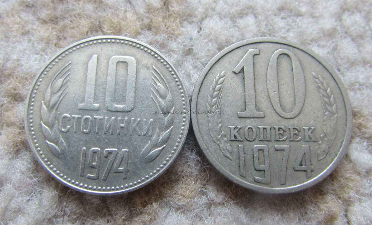 В советское время пару раз мне на сдачу давали вовсе не монетки нашей страны, а монетки других стран. Всегда это были "представители" Восточной Европы. Точно помню, что один раз получил 10 болгарских стотинок, очень сильно напоминающие наши 10 копеек. Вот для сравнения: Реверсы сильно походят, а аверсы не очень. Но цвет и размер практически идеально совпадает. После того, как союзные республики стали бывшими союзными республиками, в обороте начали попадаться и их деньги, зачастую очень сильно напоминающие наши российские. В той местности, где я живу, совершенно не было редкостью, когда незаметно на сдачу подсовывали монеты Казахстана (когда еще тиынки были). К примеру, наши 50 рублей очень сильно по цвету и размеру походили на 50 тиын. Из своего опыта помню, что получал на сдачу и украинские монетки, и монетки стран Средней Азии, и монетки стран Восточной Европы (доевровой эпохи). Это обычные "перепутки", которые совершенно не специально попадают в оборот. Они походят размером, номина