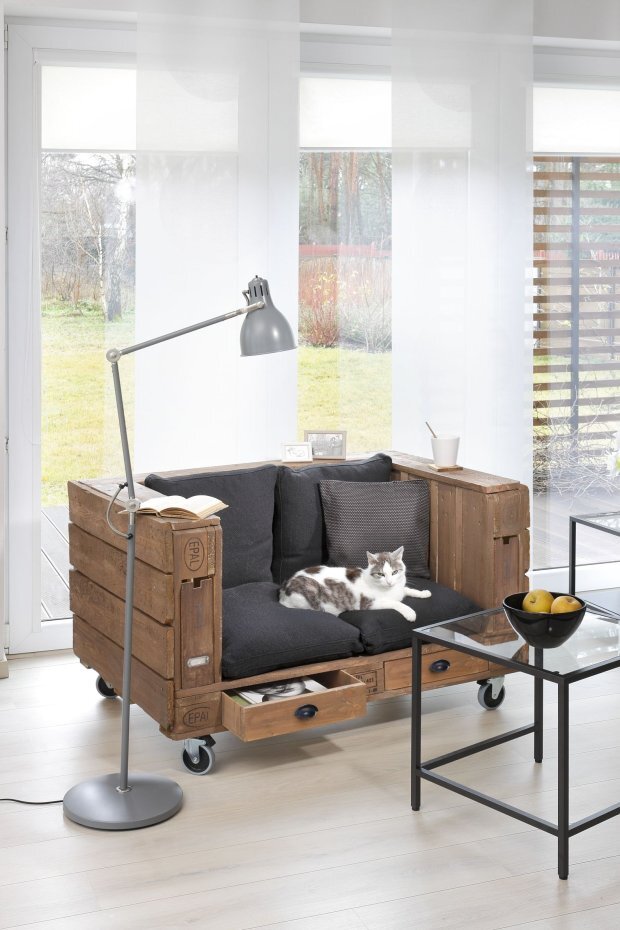 Мебель из евро-поддонов бьет рекорды популярности среди мебели, которую вы можете сделать самостоятельно. Они оригинальны по форме, практичны и удобны.Ниже я приведу пример,как можно своими руками сделать диван с выдвижными ящиками из евро поддона. Чтобы сделать данный диван из поддонов нам нужно: -3 евро-поддона с размерами 120 х 80 см,