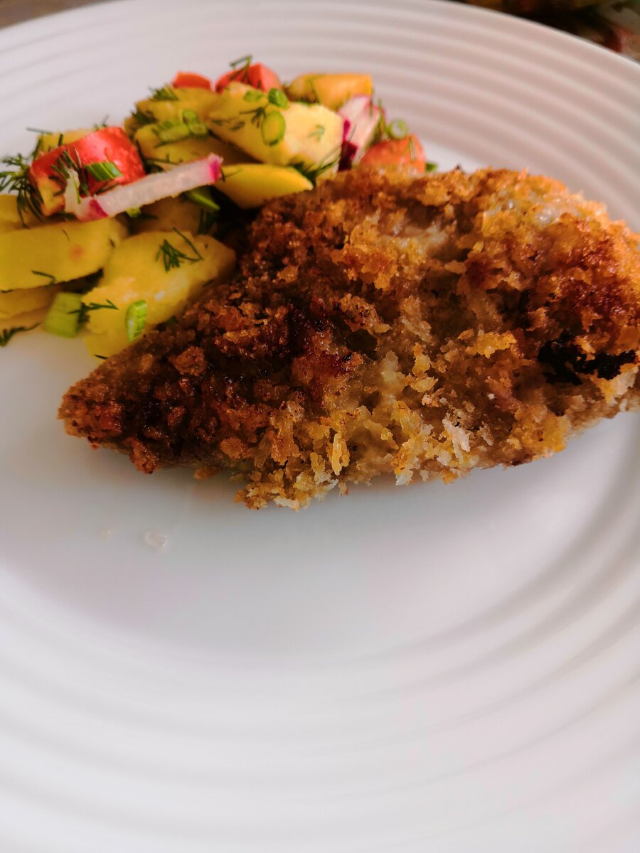 Ингредиенты: 1. Говядина крайний срез 2. Панировочные сухари 3. Мука 4. Гранулированный чеснок 5. Яйцо куриное 6. Подсолнечное масло 7. Картофель 8. Редис 9. Томаты черри 10. Соль, перец, паприка 11. Ассорти зелени Кухонный инвентарь: Как готовить: 1. Говядину порезать на кусочки и отбить толщиной 5 мл. 2. Отбитые кусочки, посолить, поперчить и посыпать паприкой. Гранулированный чеснок смешать с панировочными сухарями . Куски говядины окунуть в яйцо, затем в муку и панировочные сухари. 3. Обжарить на сковороде в растительном масле, на среднем огне по 15 минут с каждой стороны. 4. Пока шницель жарится, приготовим салат. Сварить картофель в подсоленной воде. Варенный картофель нарезать кубиками, редис и томаты черри на четвертинки, ассорти зелени мелко порубить. Посолить, перемешать, заправить растительным маслом. Салат готов! 5. Сервируем блюдо. На тарелку выложить шницель, рядом картофельный салат. Приятного аппетита и не забудьте оставить комментарий к этому рецепту!