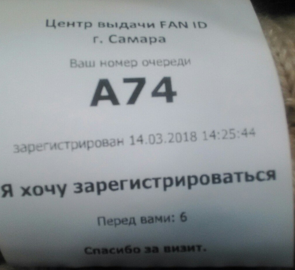 Паспорт болельщика, а иначе FAN ID – документ, обязательный для всех зрителей (включая детей) матчей Чемпионата мира по футболу FIFA 2018™, необходимый для прохода на стадион. Центр выдачи находился в самарском ТЦ "Сила Спорта".