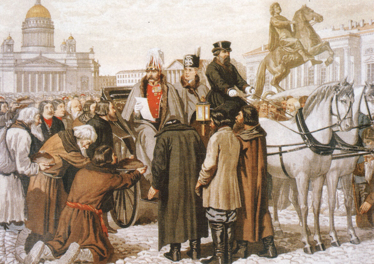 ...провозглашён Манифест об отмене в России крепостного права. Крепостное право — строй, при котором крестьяне являются собственностью помещиков, — просуществовало в России дольше, чем в большинстве стран Европы. При этом крепостничество, как явление аморальное, осуждалось большей частью общества. Крепостные крестьяне несли тяжёлую повинность — барщину (бесплатно трудились на господских землях, прислуживали в доме) или выплачивали подать — оброк. Крепостных можно было продавать, дарить, выменивать, проигрывать в карты. Формально запрещалось калечить их и убивать, продавать без земли и отдельно от семьи. Но бесправный крестьянин редко мог добиться исполнения законов. И зачастую крепостные трудились на помещиков не положенные три, а все шесть дней в неделю, их семьи голодали. Шла бойкая торговля крестьянами без земли. Из раздела объявлений газеты «Санкт-Петербургские ведомости» за 1797 г.: