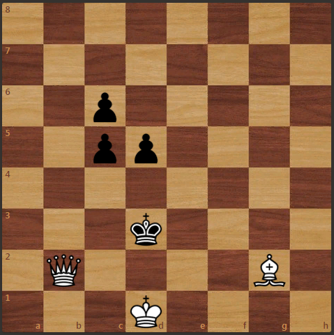 Шахматная задача. У белых в расположении ферзь и слон. Белые начинают и ставят мат в 2 хода. Черные пешки идут вниз. Подпишитесь на канал и будет много новых, интересных задач. 1. Король е1. 1. ... если черные d4. 2. Белые Ферзь b3 мат. Подпишитесь и будет много новых, интересных, познавательных задач. задача 56 тут>>> задача 57 тут>>> задача 58 тут>>> задача 59 тут>>> задача 60 тут>>> задача 61 тут>>> задача 62 тут>>>
