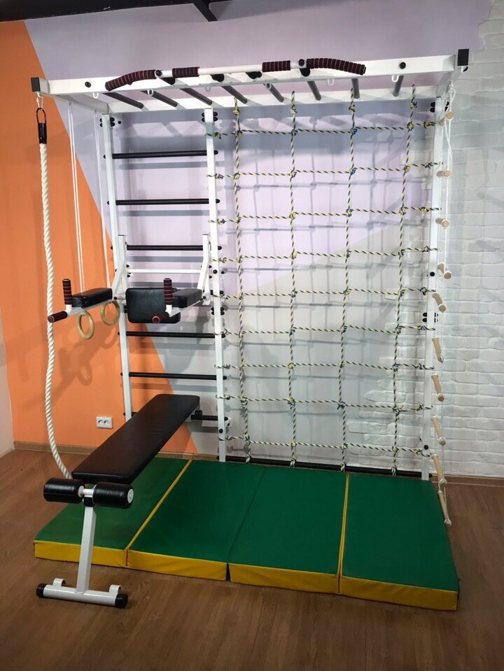 Всем привет! В этой статье я расскажу о характеристиках и преимуществах шведской стенки с рукоходом, а также покажу упражнения, которые можно на ней выполнять. Основное преимущество тренажера в наличии рукохода из 8 ступенек, сетки для лаза, турника на 4 хвата. Также по периметру рукохода приварено 12 мощных колец, на которые можно подвесить любое навесное оборудование, будь то канат, кольца, веревочная лесенка, качели, боксерский мешок. Дополнительно на шведскую стенку можно установить навесное оборудование: брусья/пресс скамья для пресса и для жима гиперэкстензию 3 в 1 - угловая, горизонтальная, обратная Также для придания безопасности занятий вашего ребенка можно дооснастить шведскую стенку складных мягким спортивным матом. Получился многофункциональный спортивный комплекс для всей семьи всего на двух квадратных метрах, который можно собрать под ваши потребности как конструктор! Технические характеристики Шведская стенка с рукоходом - усиленная. Изготовлена из мощного мета
