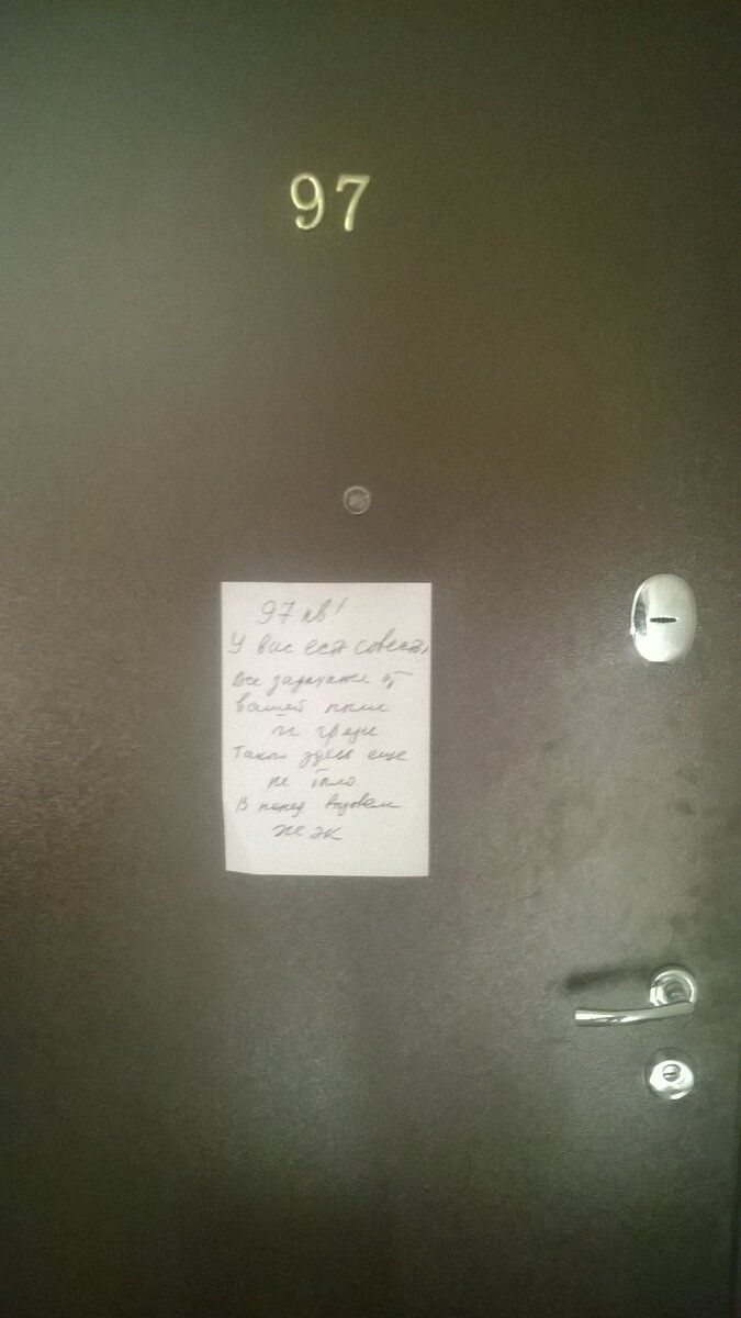 мы естественно снимаем это, не понятно на какой клей клеили но его с трудом удалили чтоб дверь не покарябать. На следующий день опять висит такая же бумага с таким же тексом. Мы опять удаляем. На третий день приходим опять эта записка с одним и тем же текстом, парни только срывать, я их останавливаю говорю не надо. Фотою сие чудо отправляю заказчикам,они перезванивают я им объясняю что случилось,говорят приедут разберутся. Где-то в середине дня опять приходит бабушка штукатур. По охала по ахала что какие же ироды такое клеют на дверь и ушла. Записка висит проходит 2 дня опять эта бабуля, сынки что вы не снимите эту записку ведь стыдно же ? Я говорю нам нет мы не долбим после 6 вечера, мы не работаем в выходные, шумные работы начинаем делать с 10 утра. Так что мы ко всем жильцам относимся по человечески, а стыдно пусть будет тем кто это приклеил. Отработав всю неделю мы ушли на выходные. В понедельник приходим на работу и вуаля новый пейзаж)