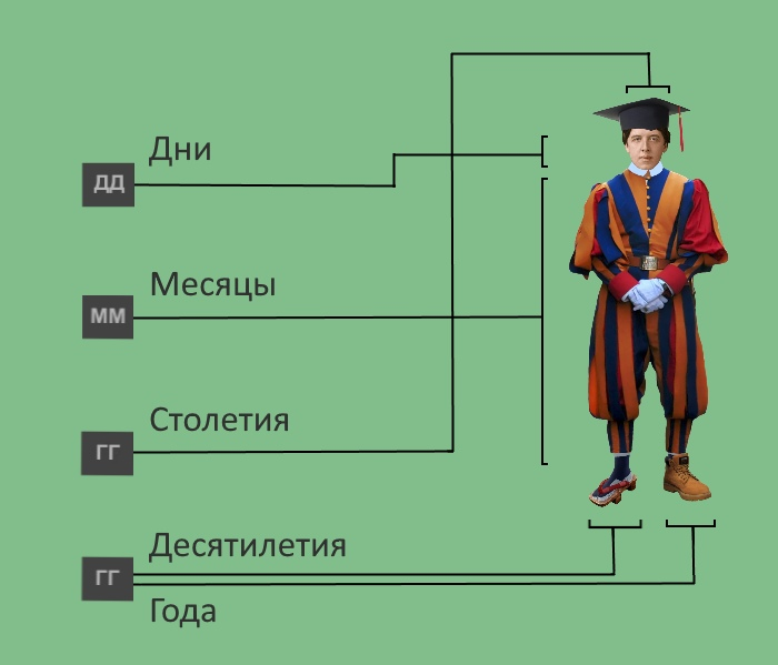 Систем запоминания дат достаточно много. Все они довольно сложны для понимания. Большая часть из них основана на мнемотехнике, и в описании дается только основа, а как этой системой пользоваться, человек должен придумать самостоятельно. Держать такую систему в голове и использовать ее на практике могут, пожалуй, только единицы. В основу системы "Хранители времени" заложена возможность представления любой даты за период с 01-01-0000 по 31-12-2099 в виде образа человека. В Системе используется международный английский формат даты DD-MM-YYYY. В отличии от других систем, система запоминания дат «Хранители времени» сразу готова к использованию. Образы, в которых зашифрована дата, уже придуманы. Ничего лишнего. Лицо, одежда, головной убор и обувь. Принцип запоминания дат по Системе также очень прост. 1.Есть событие 2.Получаем из Системы образ человека, в элементах которого «зашифрована» дата события 3.В своем воображении «связываем» событие и образ человека из Системы. Это должна быть ак