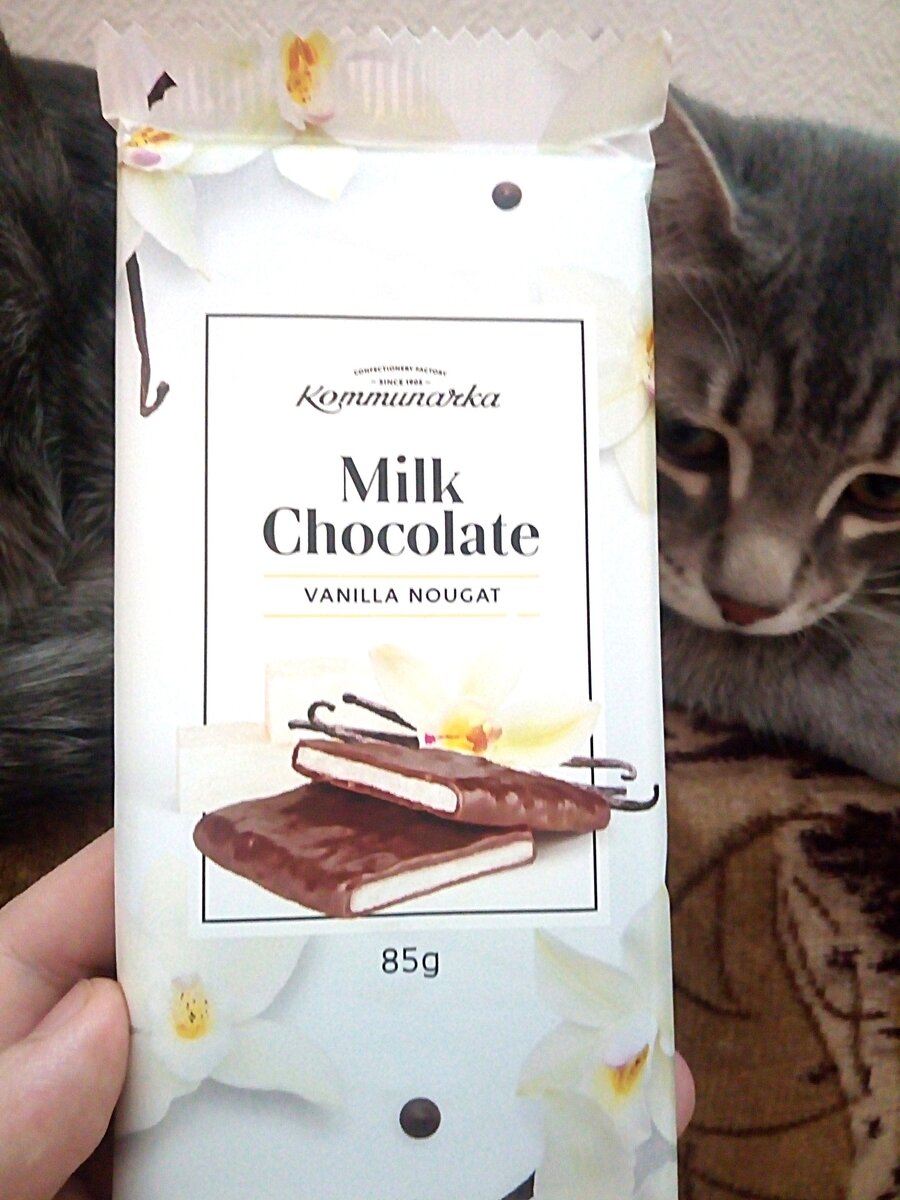 Заприметив этот шоколад с таким пронзительным и ностальгическим торговым лейблом, я просто не мог пройти мимо. Производитель, как оказалось СОАО ''Коммунарка'' и находится в республике Беларусь. Ну ладно, давайте начну его разбирать и обозревать. Открываем. И вот тут столкнулся с определённой проблемой. Упаковка приклеена мёртвым клеем. Из-за этого пришлось просто разорвать упаковку. Странно. Белорусы видимо и с содержимым тоже не особо парились и решили просто залить плитку на авось. Вот так вечно, пропадают хорошие детские воспоминания из-за таких вот нюансов. Наломал шоколадку как пришлось в тарелку и собрался пробовать. Вдруг прибежал кот Симон и его поступок меня удивил и поразил. Понюхав как обычно шоколад, он вдруг начал его закапывать. Что это? Коту явно что-то не понравилось и это происходит с ним впервые. Смотрим состав. Сахар, какао-масло, какао тёртое, сливки сухие Молоко сухое цельное, эмульгатор, ароматизатор ''ваниль'' Начинка ( патока, сахар, жир кондитерский, сахарна
