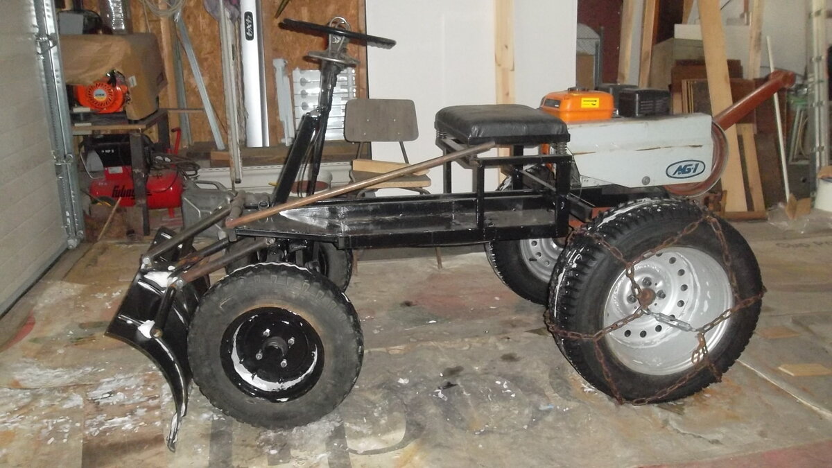 Мотоблок - отличный помощник, но за ним надо ходить, и порой прилагать немалые физические усилия. Эх, хорошо бы было, если б он меня катал! Не бегает же ямщик за экипажем. Были попытки использовать его с прицепом. Конструкция страшно неуклюжая, неудобная в управлении, при обработке почвы не применимая. Увеличивать парк техники не хотелось. Отказываться от мотоблока мы были не готовы. Решили делать адаптер, который мог бы легко отсоединяться. Толчком для начала воплощения проекта послужили прошлогодние обильные снегопады. Что получилось смотрите в конце статьи. Рама сварена из профильной трубы 50Х25 мм. Крепление к мотоблоку всего двумя болтами! Передняя балка из трубы 60Х40 мм крепится к раме НИВовской крестовиной. Ступицы и рулевое от мотоколяски. Рулевые тяги ВАЗ. Для установки задних колес к отрезку трубы были приварены жигулевские ступицы. Ну и конечно отвал, куда же без него. Мой главный мотиватор и ускоритель процесса, со словами: "Деда открывай ворота, поехали на тракторе