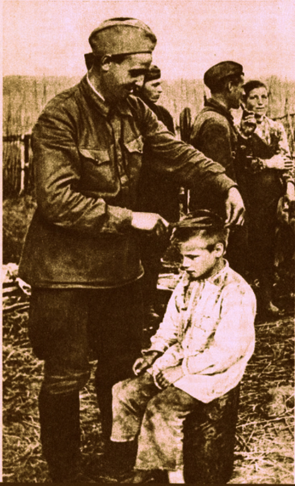 «До чего же ты оброс, хлопец! Давай подстригу, будешь на солдата похож!» — так, а может, немного иначе шел разговор в том далеком сорок втором. И хоть, наверно, дергала парнишке волосы старенькая армейская машинка, терпел он мужественно и гордился потом перед сверстниками, что постриг его солдат и «под солдата»...