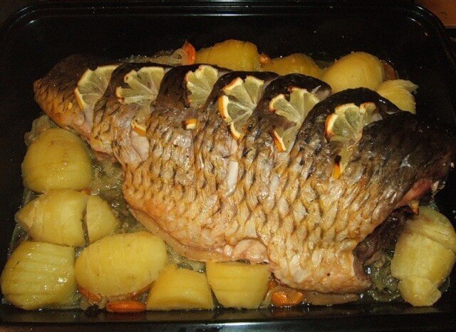 Карп с картофелем готов! Подавайте его на большом, красивом блюде, чтобы угощения точно хватило всем членам семьи или гостям.