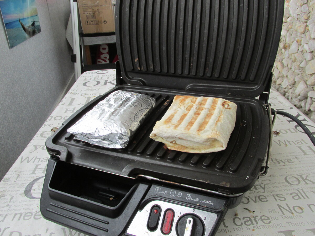 - 2 вариант. Оставляем все как есть (без фольги). Я делаю одновременно оба варианта, чтобы показать вам, как это выглядит. Различие получается только в корочке. В 1 варианте ее нет, т.к лаваш не соприкасается с нагревающей поверхностью. Это для тех, кто любит нежную и горячую пищу. А во 2 случае, лавашик подгорает, но в меру. Кто любит поджаристый лаваш, самое то.