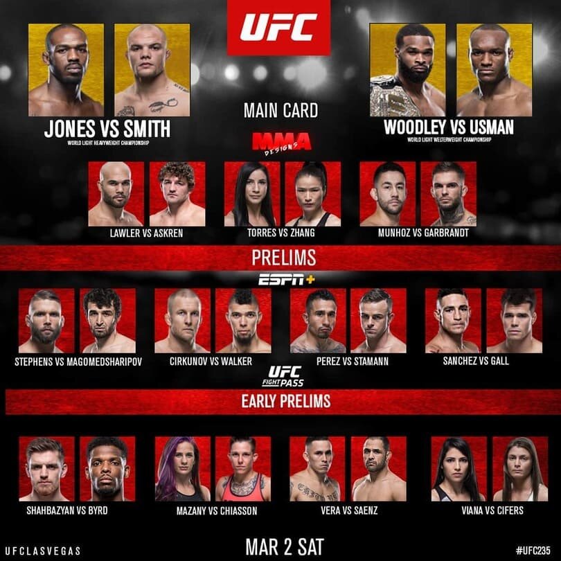 Предлагаем Вам ознакомиться с результатами турнира UFC 235! В первом поединке турнира, Ханна Сайферс победила Полиану Виану раздельным решением судей (29-28, 28-29, 29-28) В следующем бою Мэйси Чиассон победила Джину Мазани техническим нокаутом в первом раунде(раунд 1, 1:49) Эдмен Шахбазян победил Чарльза Берда (раунд 1, 0:38) Диего Санчес победил Микки Галла в конце второго раунда техническим нокаутом(раунд 2, 4:13). Это первая досрочная победа для Диего с 2008 года. Коди Стэман победил Алехандро Переса единоглассным решением судей (29-28, 29-28, 30-27) Джонни Уокер коленом нокаутировал Мишу Циркунова (раунд 1, 0:36). Стоит отметить, что Джонни на последнии три боя в UFC затратил менее трех минут. В следующем поединке Забит Магомедшарипов не без труда победил Джереми Стивенса, единогласным решением судей, все трое судей отдали Забиту 29-28. Кодм Гарбрандт отлично вел поединок пока не пропустил тяжелый удар от Педро Муньоза после которого смог восстановиться. После чего он устроил н