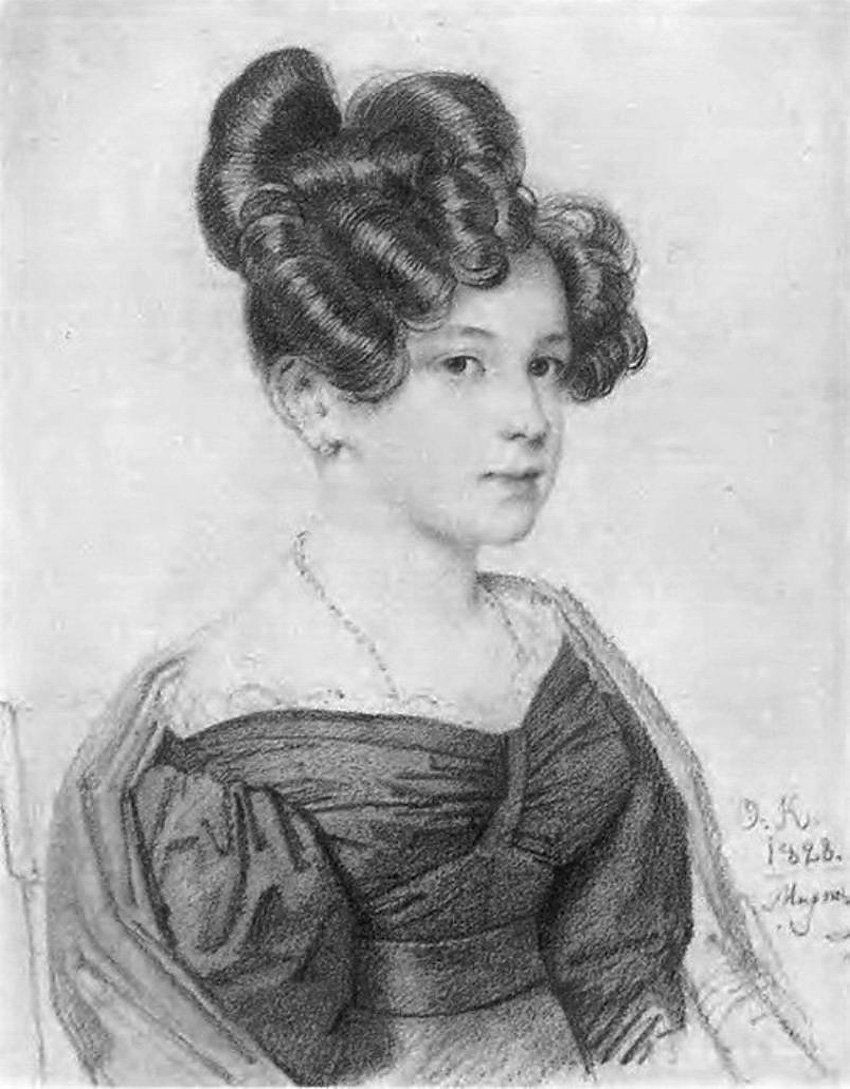 Анна Алексеевна Оленина (1807-1888)- дочь известного мецената и ученого, директора Императорской публичной библиотеки, позднее - Президента Академии художеств и члена государственного совета - Алексея Николаевича Оленина. Анна Алексеевна Оленина была младшей дочерью в семье. По линии матери приходилась двоюродной сестрой Анне Керн. Благодаря отцу, знавшему десять языков, получила прекрасное образование. Сама она писала: «Батюшке я сама во многом обязана, от его истинного глубокого знания и мне кое-что перепало. В его разговорах, выборе для меня книг и в кругу незабвенных наших великих современников: Карамзина, Блудова, Крылова, Гнедича, Пушкина, Брюллова, Батюшкова, Глинки, Мицкевича, Уткина, Щедрина и прочих почерпала я всё, что было в то время лучшего». Сама Анна знала 7 языков. В 17 лет она стала фрейлиной Императриц Марии Федоровны и Елизаветы Алексеевны. Анна Оленина считалась одной из красивейших женщин эпохи Николая I: чудные глаза, золотые локоны, маленькая ножка, увековеч