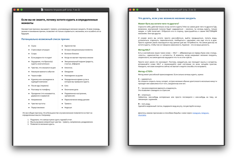 Самое неприятное желание закурить возникает тогда, когда мы не знаем причину его появления (в большинстве случаев, это не никотиновая зависимость). А если такое случается часто, пиши-пропало. Тревога так и хлещет в ответ на неизвестное, усиливая желание закурить. Справиться с этим состоянием не так сложно, как кажется. Достаточно вытащить причину на свет, и сразу станет легче. Ведь теперь вы понимаете, что вызывает желание закурить. Тревога ослабевает, тяга тоже. Да и мотивация усиливается, так как вы справились еще с одним позывом. Но порой, найти причину появления тяги достаточно сложно. И чтобы облегчить вам задачу, я составил для вас список типовых причин. Кликните сюда, чтобы скачать его. Кроме списка, там вы найдете способы борьбы с желанием закурить. Качайте, делитесь своими впечатлениями и предложениями.
