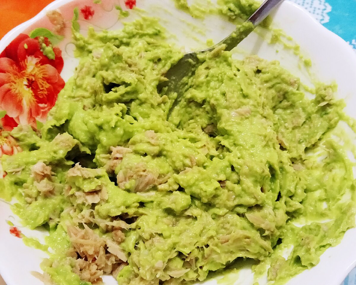 Руководствуйтесь пропорциями: 1 авокадо + 1/2 баночки тунца. Обязательно добавьте скромную щепотку соли и чайную ложку оливкового масла и тщательно перемешайте все ингредиенты.