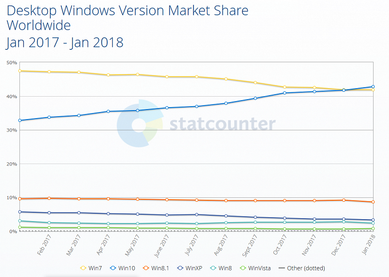 Мировая рыночная доля Windows 10 достигла 42,78% Свежий отчет StatCounter наверняка понравится Microsoft: аналитики отметили, что впервые доля Windows 10 превысила долю Windows 7 в мировом масштабе. Распределение теперь выглядит следующим образом: доля Windows 10 – 42,78%, доля Windows 7 – 41,86%. Это вполне закономерное развитие событий, так как случаи регионального превосходства Windows 10 над Windows 7 фиксировалось уже давно. К примеру, в Великобритании это случилось еще в июне 2016 года, а в США – в январе 2017 года. Генеральный директор StatCounter прокомментировал новые данные кратко, но достаточно эмоционально: «это прорыв для Microsoft». В отчете аналитиков отмечается, что доля Windows 7 до сих пор высока по причине того, что за эту ОС держатся бизнес-пользователи. В плане перехода на новые версии они традиционно более консервативны, чем домашние пользователи. Так что можно думать, что несмотря на перекрест на графике, доля Windows 7 в ближайшие несколько лет по-прежнему буд