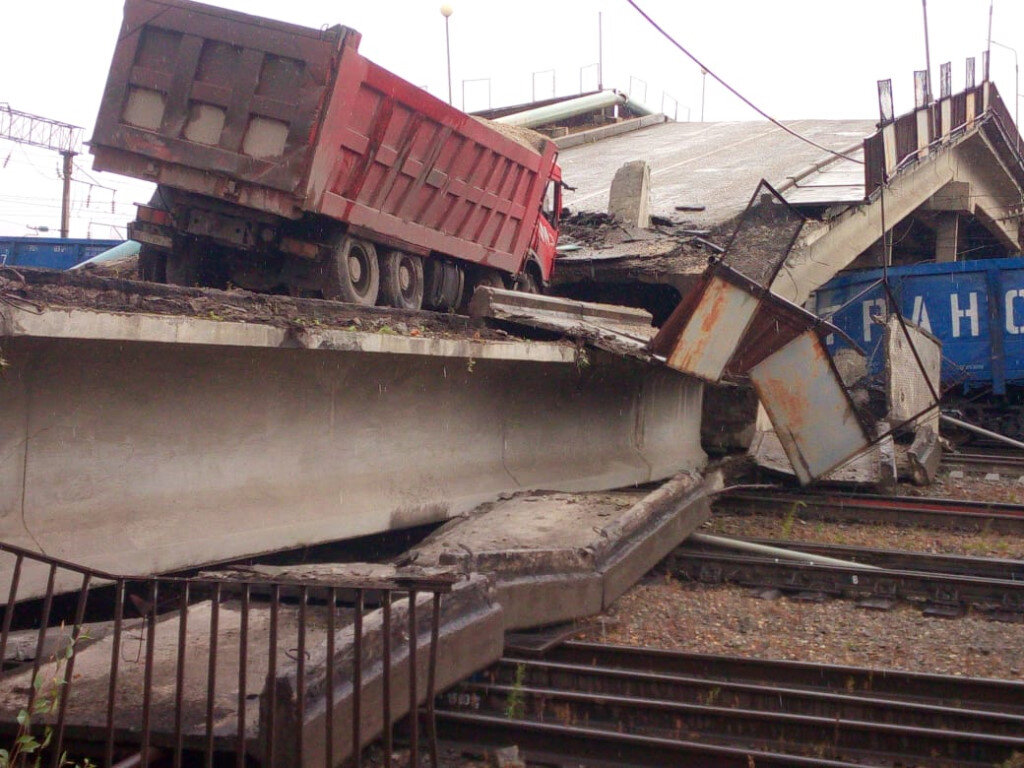 9 октября 2018 года в городе Свободный Амурской области произошло частичное обрушение бетонных конструкций автомобильного моста на проходящий под ним грузовой поезд. Обрушение моста попало на камеры наружного видеонаблюдения. Мост имеющий деградационные изменения структуры бетона и несущих конструкций не выдержал груженого автомобиля въехавшего на него. После того как специальная комиссия закончила расследование причин происшествия было необходимо демонтировать оставшиеся пролеты моста, так как из-за частичного обрушения было остановлено движение по Трассибу. Ввиду того, что бетонные конструкции могли обрушиться в любой момент, разборка с помощью техники была не возможна и опасна. Был выбран необычный вариант - ронять опоры тепловозом с помощью троса. На видео очевидцев видно как роняли пролеты моста. Тепловоз начинает двигаться, тянет трос и роняет несущие опоры. Вслед за опорами падает и сам мост прямо на пути. Понравилась публикация ставьте палец вверх, подписывайтесь на канал, де