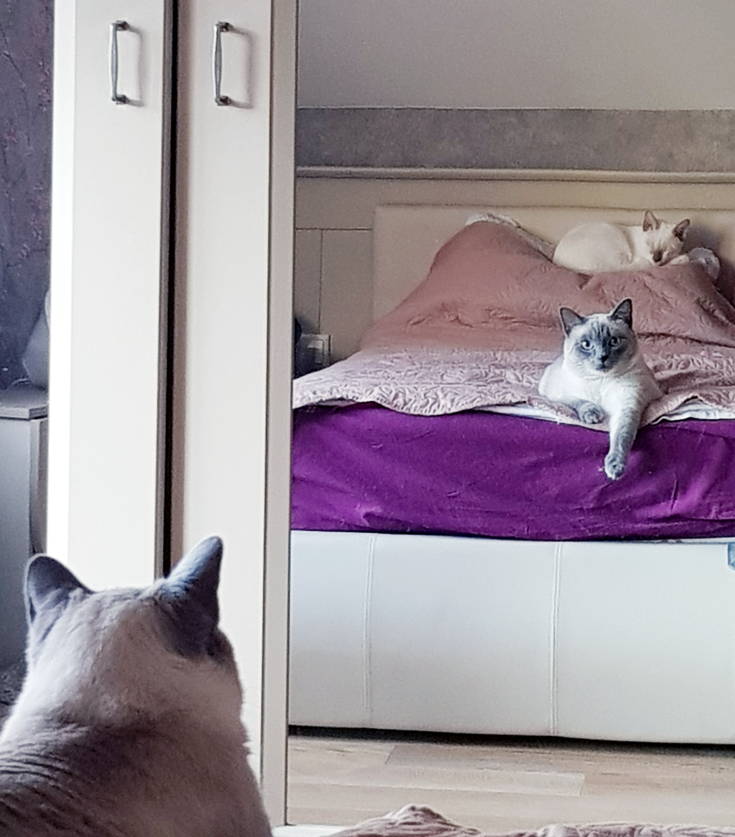 Начало "котоблога" - ЗДЕСЬ... Не так давно, наблюдая за котами, мне стало интересно, видят ли они себя в зеркале и осознают ли, что это они там отражаются... Я продолжила наблюдать и, пришла к выводу, что мало того, что они видят и понимают, что в зеркале они, так еще и используют зеркало в личных целях :))) Например, наш Стёпа специально ложится на кровать так, чтоб видеть в зеркало, что за его спиной делает Митя. Он чётко фиксирует каждое его движение и, когда Митя занимает позу охотника, означающую, что сейчас случится нападение, Степка, увидев это в зеркале, действует на опережение: ловко подскакивает в воздухе, разворачивается и в один прыжок нападает сам. При этом на его мордочке читается ликование и торжество :)) Митя тоже нередко рассматривает себя в зеркале. Комично было, когда он устроил шествие у зеркала, будто бы изучал свою походку. Мы очень часто смеемся над ним, из-за его походки. Стёпа тот ходит изящно, мягко, лапки переставляет аккуратно. Митя же шагает иначе. Ему бы