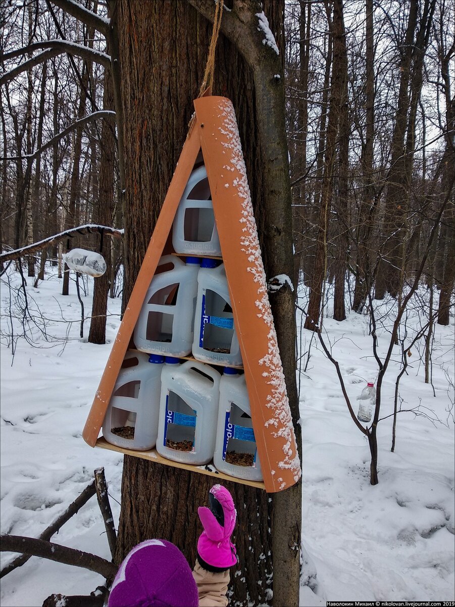 Сегодня в лесопарке была обнаружена вот такая мегакормущка для птиц. Каждый этаж на фанерке, все на совесть скручено на саморезы разного размера. В общем подошли очень серьёзно. А еды в кормушке насыпано с достатком. Причём, правильной птичьей еды.