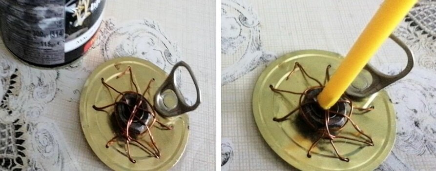 Я изготовила устройство из консервной банки, она открывается без помощи открывашки и из крышечки сделала вот такое приспособление: